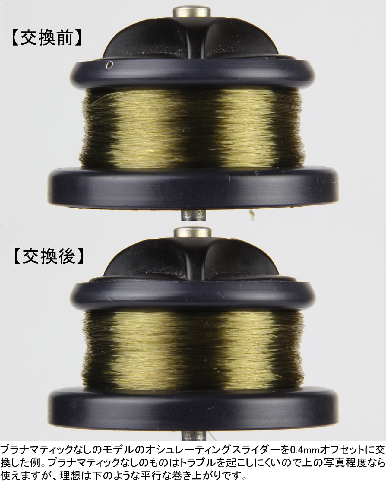 オフセット量は2種類あります。このページの0.4mmと0.9mm(別ページ)からお持ちのリールに向くものをお選びください。巻き形状変化は写真を参考にしてください。