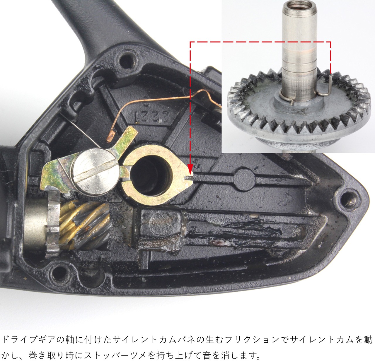 機構は80年代のサイレントストッパーと同じ原理で、きわめて信頼性の高いものとなっています。しかも、オリジナル状態のラチェット抵抗がギア比である5.2倍でハンドルに伝わるのに対し、当製品はドライブギアからストッパーを制御する摩擦力を得ているため、ほとんど回転が重くなりません。