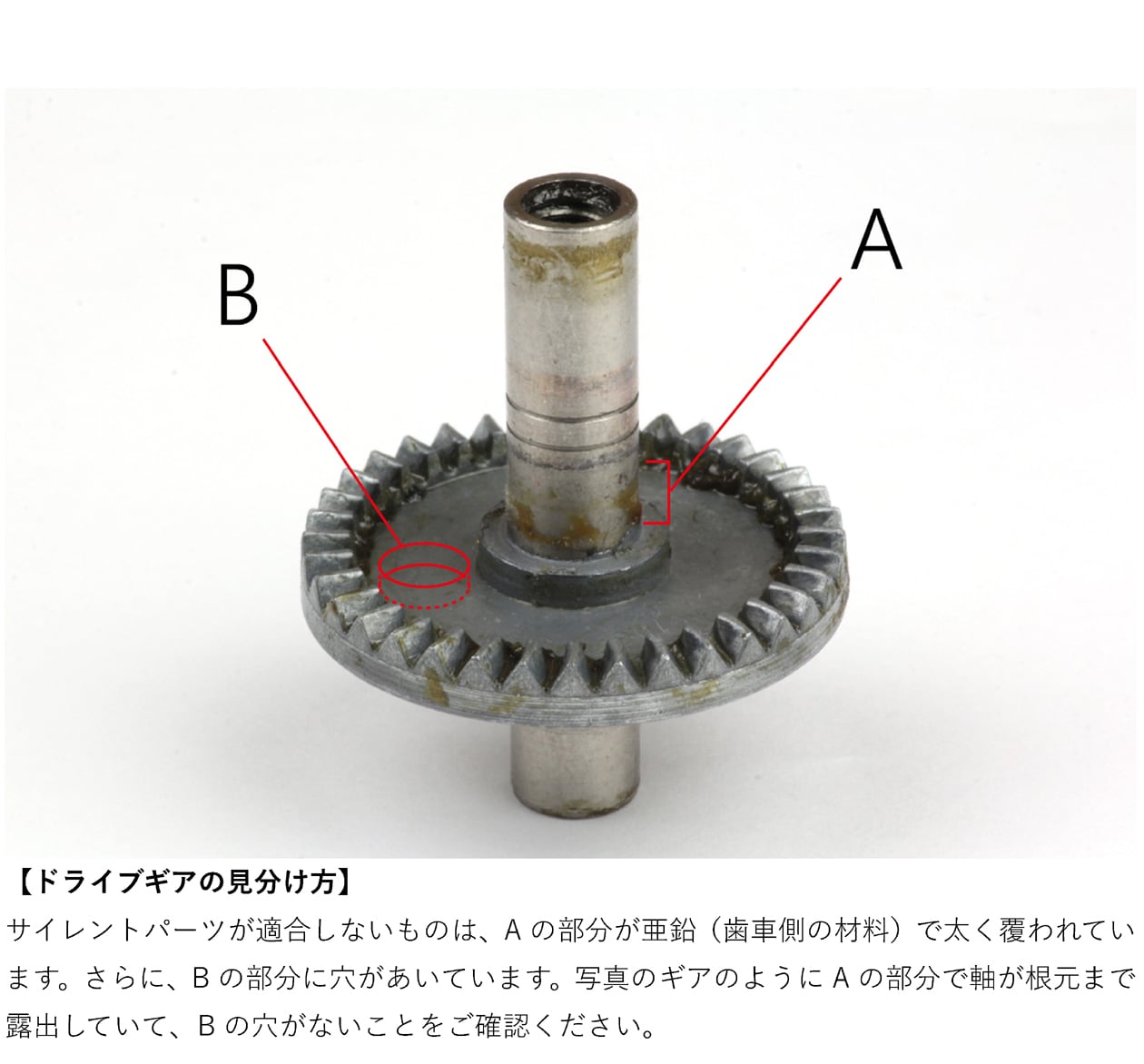 タックルオートNo.1において輸出用のサイレントカム仕様のギアが組み込まれたものがあることがわかりました。そうしたものは当製品が取り付けられませんので、写真説明【ドライブギアの見分け方】をご確認ください。